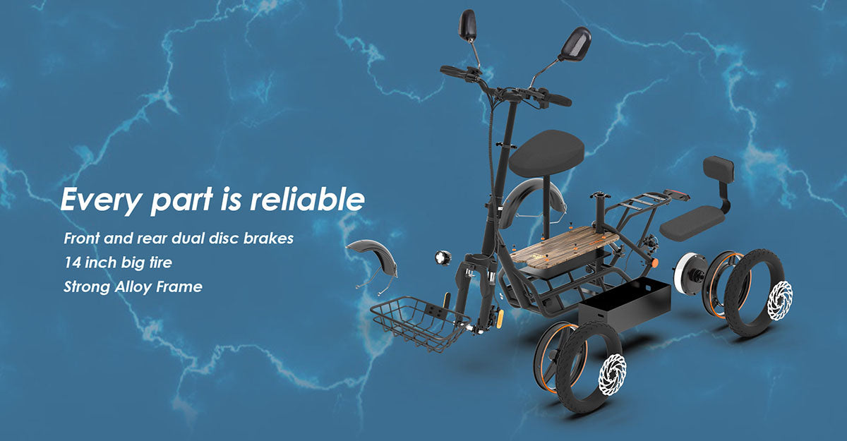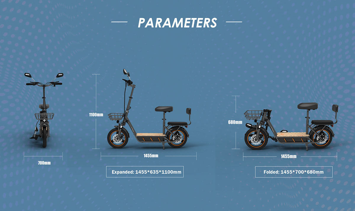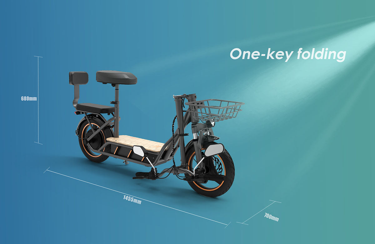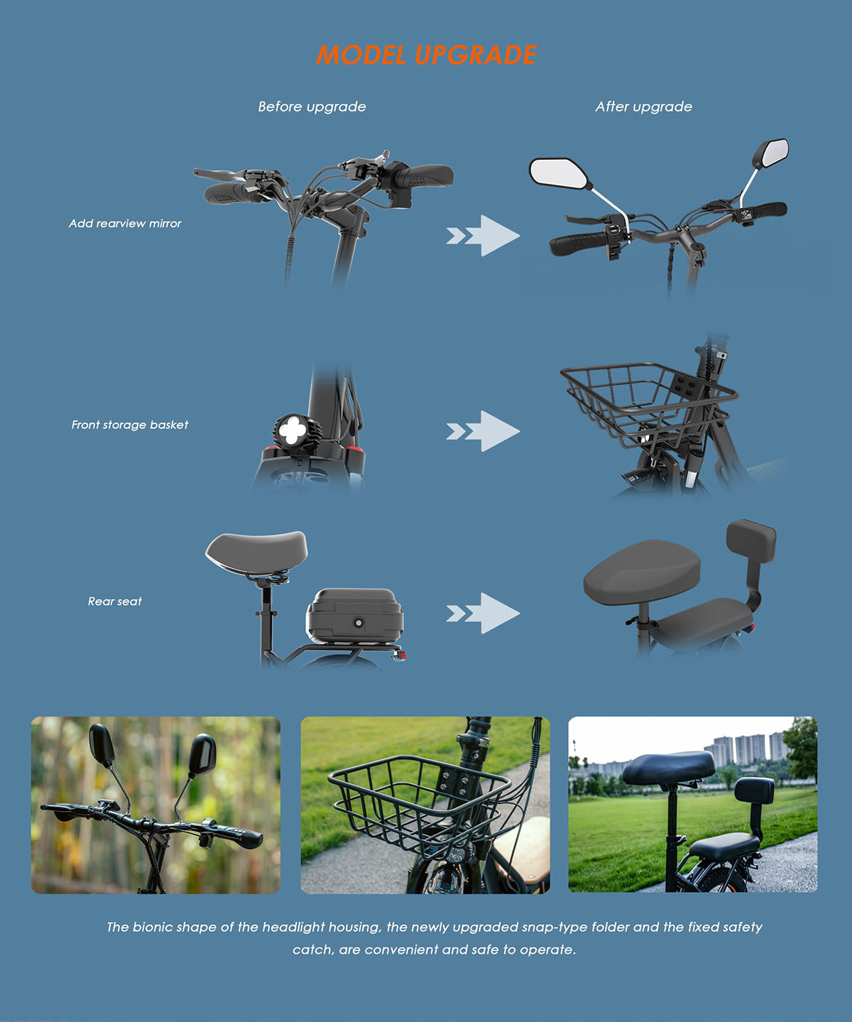 The rear storage box has been replaced with a rear seat, capable of carrying approximately 70-80 kg. Additionally, a front basket has been added for convenient transportation of shopping bags or backpacks.