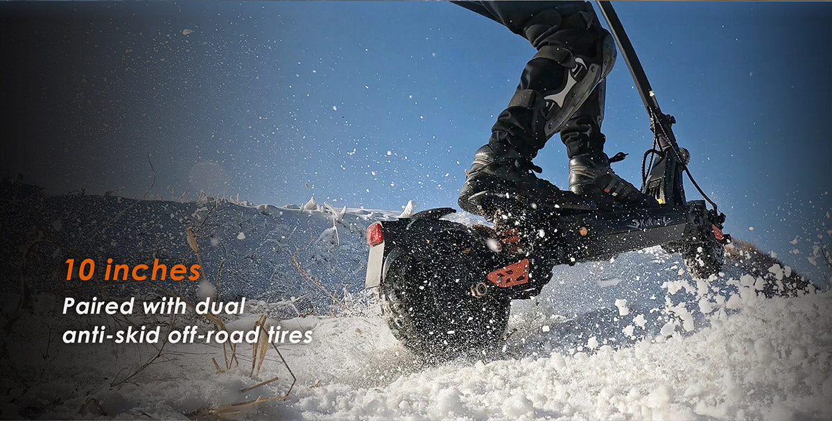 The front and rear dual disc brake design allows you to brake and decelerate more easily, providing good control and strong protection for your ride. Dual disc brakes can better distribute the braking force, helping the electric scooter maintain stability and controllability. Compared with traditional braking methods, disc brakes have a larger friction area and better heat dissipation, making them more durable.